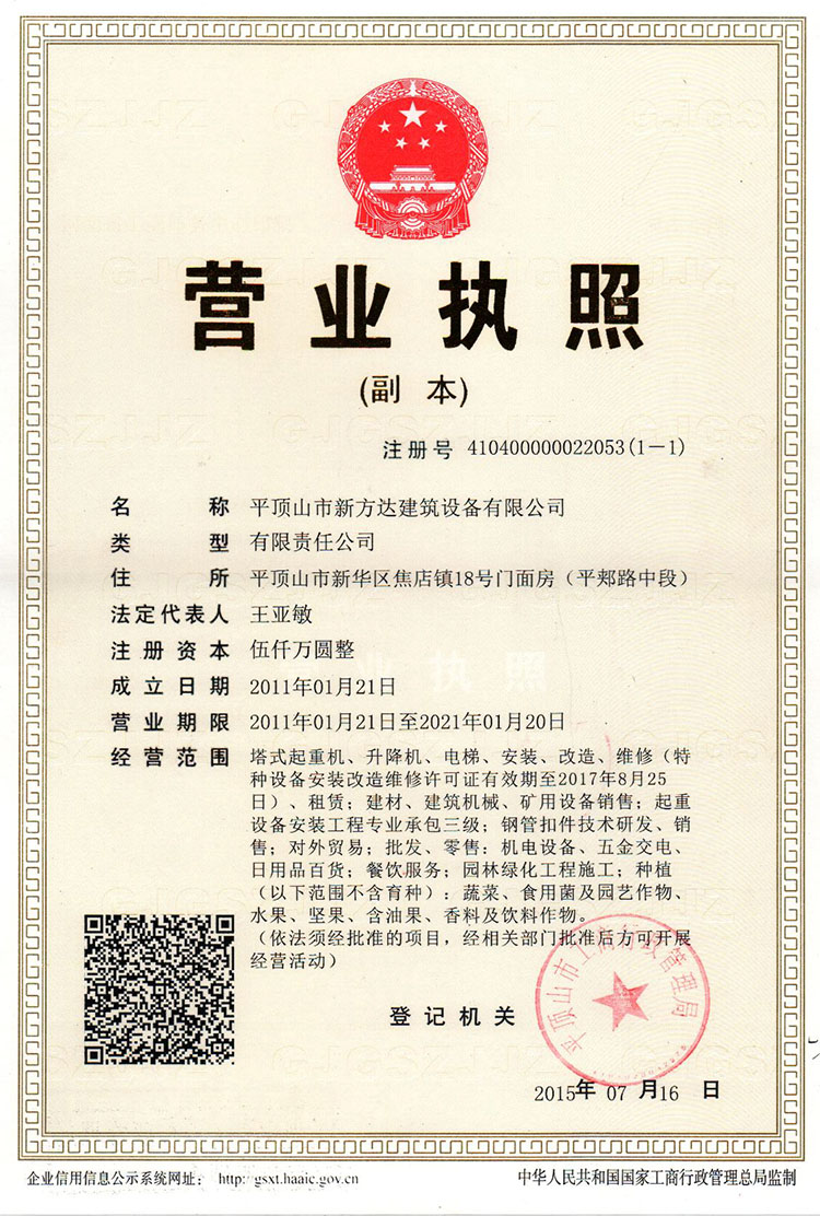 ? ? ? ?平頂山市新方達建筑設備有限公司主要業務包括:各種型號塔吊、施工升降機、物料提升機、小型建筑機械的銷售、租賃、安拆、養護維修、土建工程施工、物流運輸、園林花卉、企業咨詢、企業策劃、廣告制作發布、新型全鋼液壓成型標準扣件(本公司專利產品)的設計、研發、生產、銷售,各種土建工程的勞務承包、勞務輸出、農牧業開發、生態園開發建設等業務。