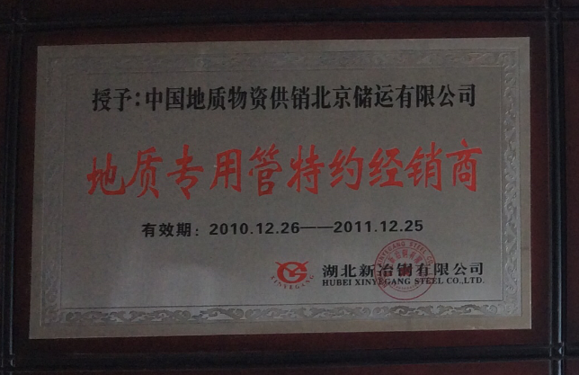 中國地質物資供銷北京儲運有限公司是國有大型物資流通企業,是寶鋼、包鋼、鞍鋼、冶鋼、天津鋼管公司地質管專項代理。鄭州分公司是總公司在河南設立的唯一銷售機構,地質專用管材是本公司的特色經營,常年保持庫存1萬噸左右,年銷量售額過億元。所售產品均執行國家標準,適用于工程、煤礦、紡織、電力、鍋爐、機械、軍工等各個領域。公司以良好的信譽、優質的產品、雄厚的實力、低廉的價格享譽全國30多個省、市、自治區,產品深得用戶依賴。始終秉承“誠實做人,誠信做事”的方針,遵循“以市場為導向,以客戶為依托,以質量求生存,以雙贏為目的”的經營宗旨。遵循“以科技創新求發展,依靠質量求生存”的原則,用最好的質量,最好的服務,最全的規格,最優的價格,與新老客戶通力合作,攜手并進,開創新的未來,再創新的輝煌。
